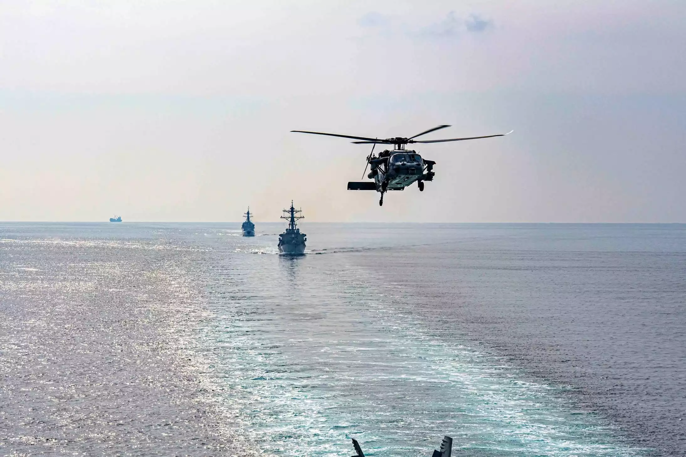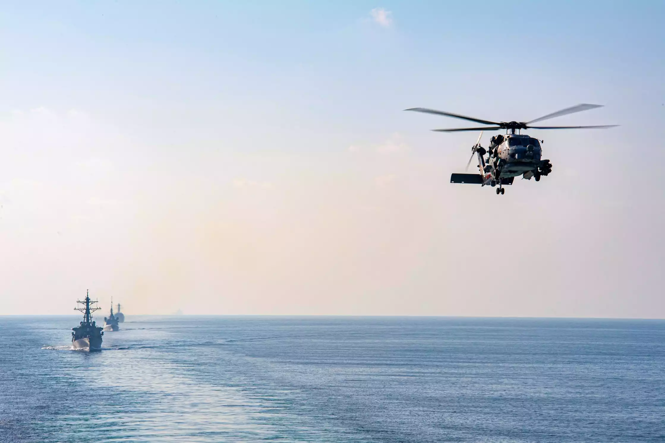 MH-60S Seahawk der US Navy während eines Begleitflugs des CSG 2 in der Straße von Hormus. US Navy