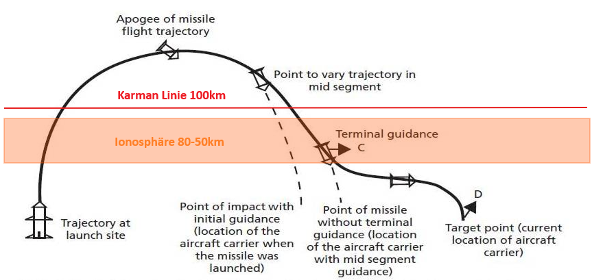 Es gibt einen Typ Waffe, der sich Anti Ship Ballistic Missile" nennt, ASBM. Dieser Typ Waffe ist im Westen nicht wirklich verbreitet, erfreut sich aber Richtung Asien zunehmender Popularität. Das sind Seezielflugkörper, die im Reiseflug einer ballistischen Flugbahn folgen um große Reichweiten schnell zu überwinden und in einem Endanflug mit supersonischen oder hypersonischen Geschwindigkeiten, Schiffe bekämpfen sollen.